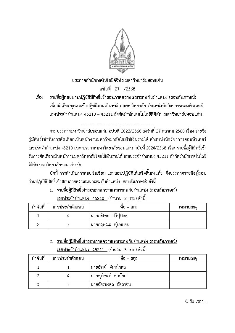 ประกาศรายชื่อผู้สอบผ่านปฎิบัติ เข้าสอบความเหมาะสมกับตำแหน่ง (สอบสัมภาษณ์) เลขตำแหน่ง 45210 45211 สังกัดสำนักเทคโนโลยีดิจิทัล มหาวิทยาลัยขอนแก่น